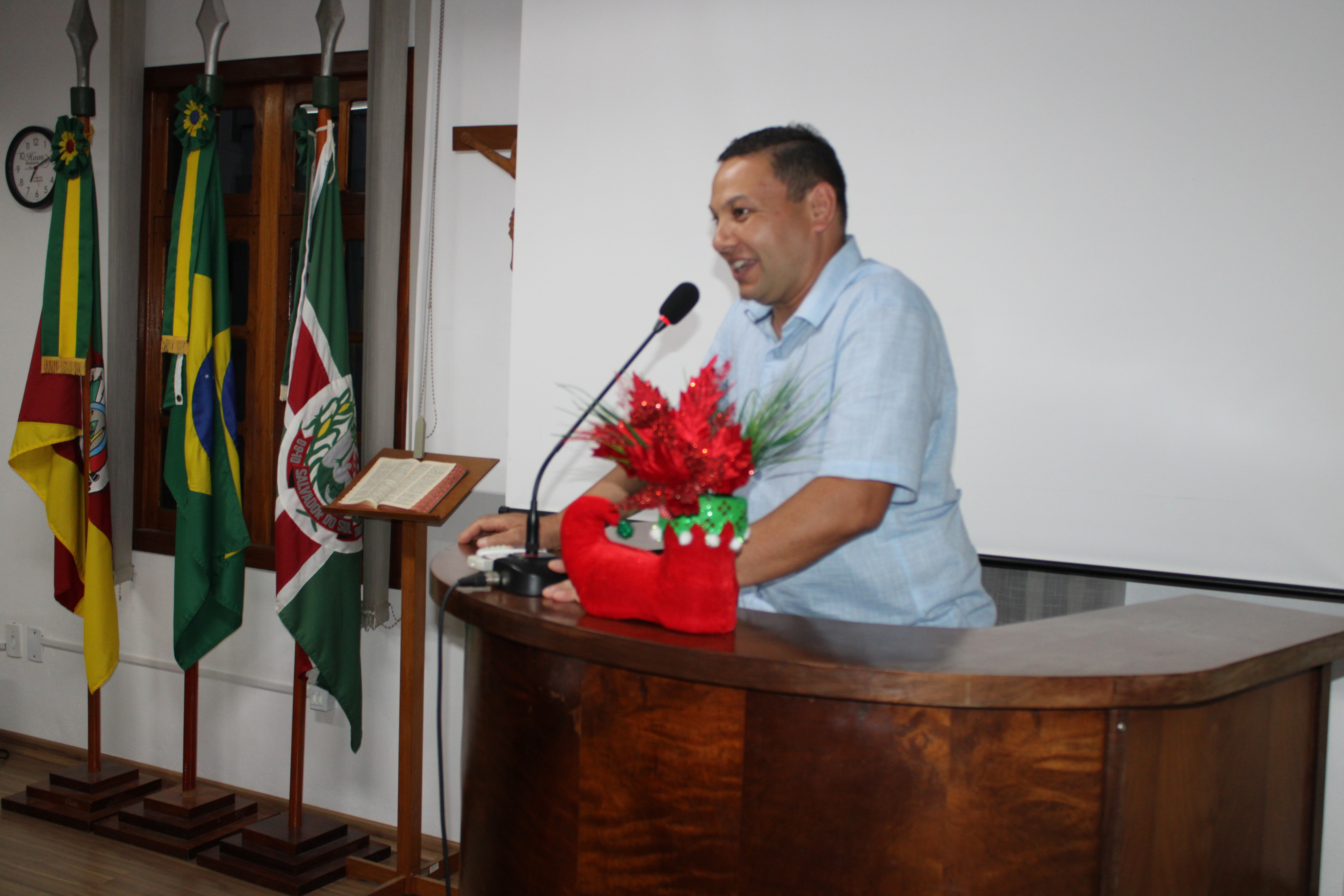 Realizada ontem sessão ordinária, contamos com a presença do Vereador suplente Tiago Oliveira Bento no uso da tribuna, onde agradeceu aos colegas pelo tempo de trabalho juntos substituindo a vereadora Carla em seu tempo de licença, e desejou um Feliz Natal e um Feliz Ano Novo a toda comunidade salvadorense. Projetos protocolados pelo Executivo onde foram aprovados seis projetos: