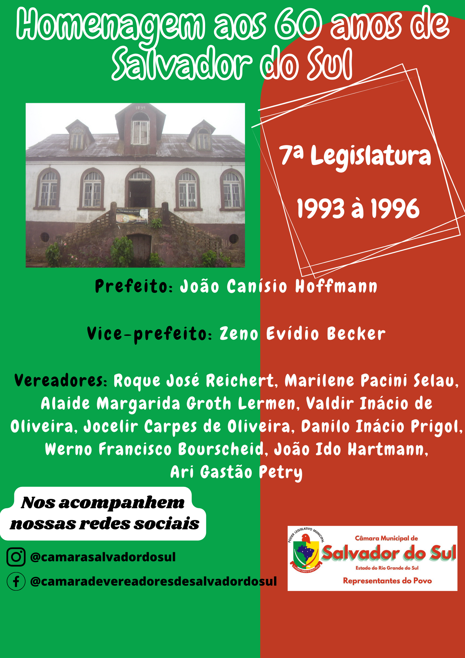 7ª Legislatura - 1993 à 1996:Prefeito: João Canísio HoffmannVice-prefeito: Zeno Evídio BeckerVereadores: Roque José Reichert, Marilene Pacini Selau, Alaide Margarida Groth Lermen, Valdir Inácio de Oliveira, Jocelir Carpes de Oliveira, Danilo I...