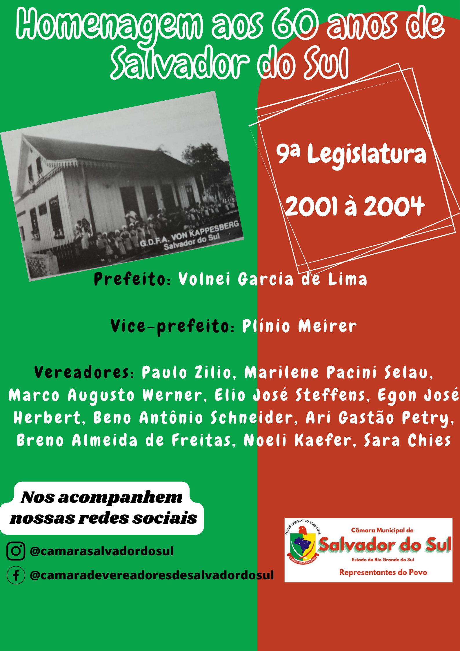 9° Legislatura - 2001 à 2004:Prefeito: Volnei Garcia de LimaVice-prefeito: Plínio MeirerVereadores: Paulo Zilio, Marilene Pacini Selau, Marco Augusto Werner, Elio José Steffens, Egon José Herbert, Beno Antônio Schneider, Ari Gastão Petry, Bren...