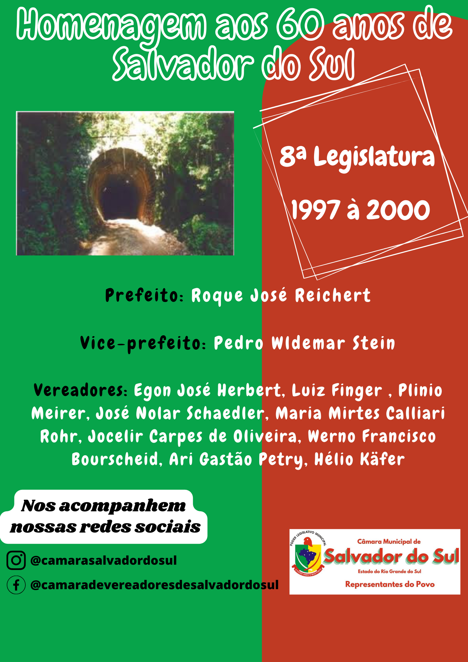 8° Legislatura - 1997 à 2000:Prefeito: Roque José ReichertVice-prefeito: Pedro Wldemar SteinVereadores: Egon José Herbert, Luiz Finger , Plinio Meirer, José Nolar Schaedler, Maria Mirtes Calliari Rohr, Jocelir Carpes de Oliveira, Werno Francisco...