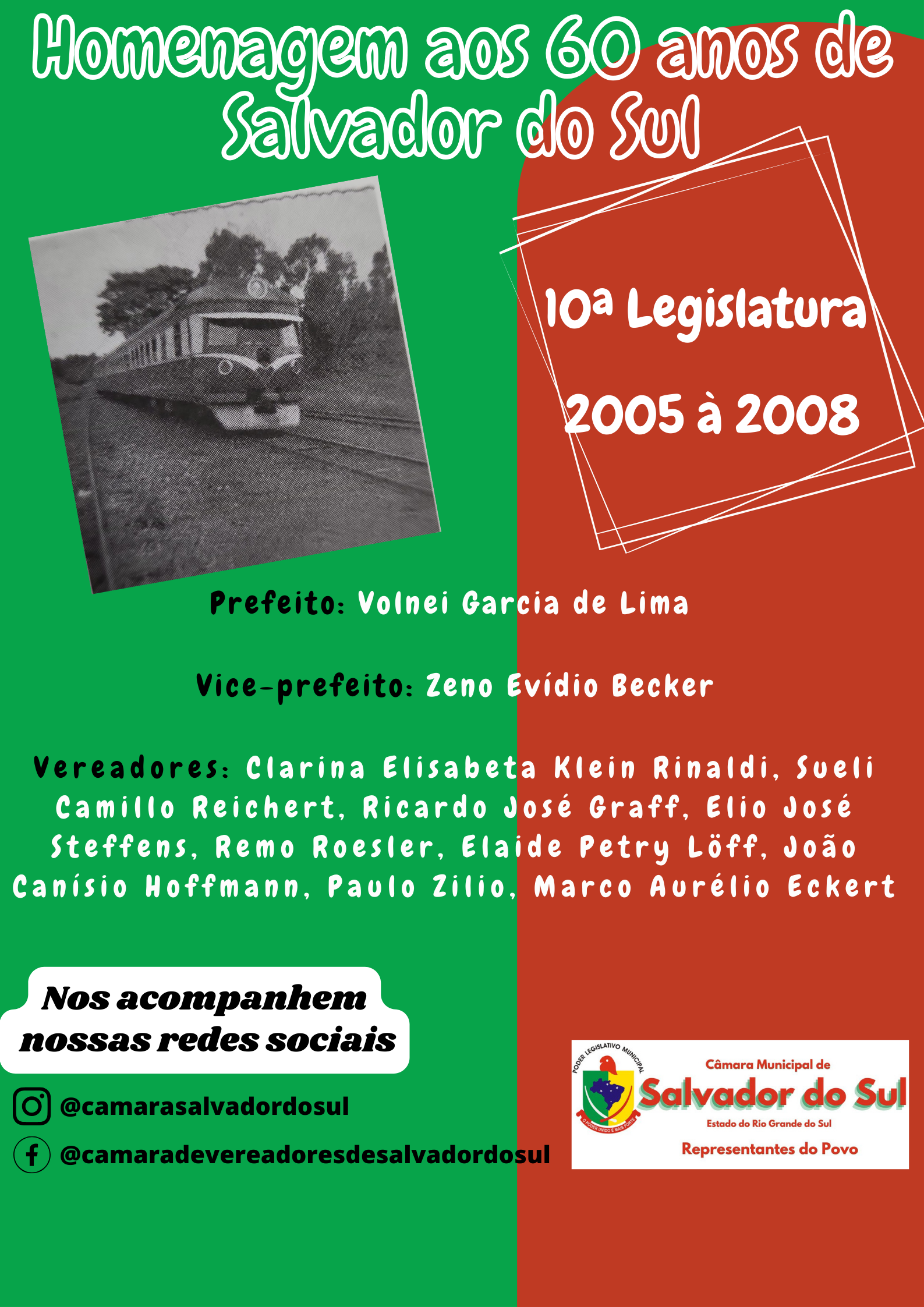 10ª Legislatura - 2005 à 2008:Prefeito: Volnei Garcia de LimaVice-prefeito: Zeno Evídio BeckerVereadores: Clarina Elisabeta Klein Rinaldi, Sueli Camillo Reichert, Ricardo José Graff, Elio José Steffens, Remo Roesler, Elaide Petry Löff, João Ca...