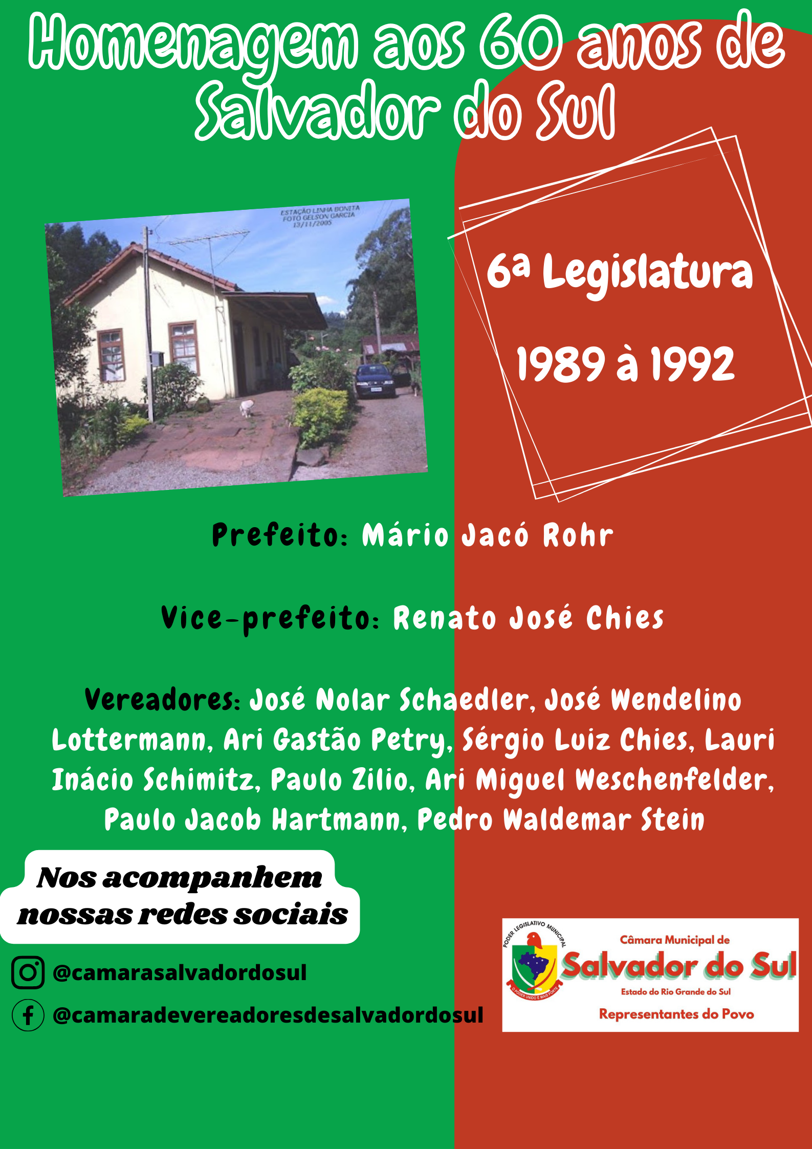 6ª Legislatura - 1989 à 1992Prefeito: Mário Jacó RohrVice-prefeito: Renato José ChiesVereadores: José Nolar Schaedler, José Wendelino Lottermann, Ari Gastão Petry, Sérgio Luiz Chies, Lauri Inácio Schimitz, Paulo Zilio, Ari Miguel Weschenfel...