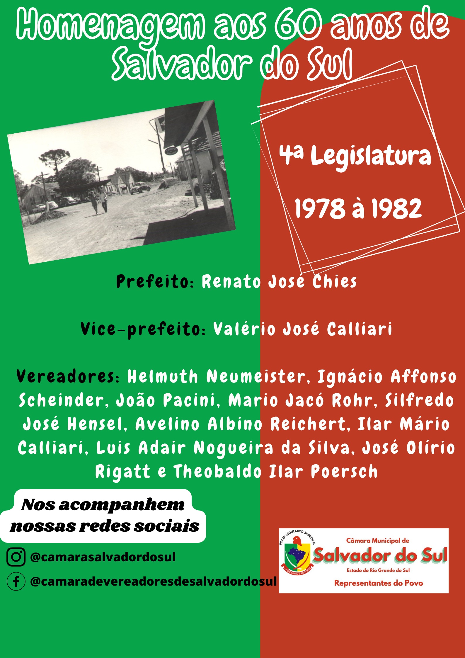 4ª Gestão - 1978 à 1982:Prefeito: Renato José ChiesVice-prefeito: Valério José CalliariVereadores:Helmuth Neumeister, Ignácio Affonso Scheinder, João Pacini, Mario Jacó Rohr, Silfredo José Hensel, Avelino Albino Reichert, Ilar Mário Callia...